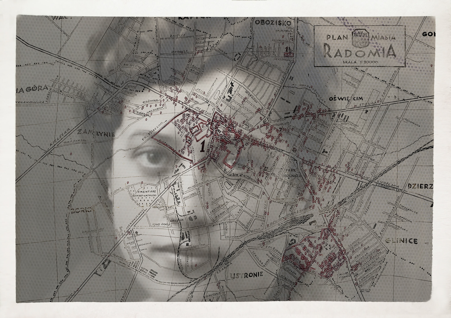 This is a 1941 map of Radom using the archives of the ID card applications to pinpoint (with red dots) where Jews resided between February-April 1941 (The map is provided courtesy of POLIN Museum. Pinpoints of the 1200 Jewish homes and the outlines of the ghettos as of April were provided by Luke Rothman). The image here includes that of my mother, seemingly peering through the outlines of her city, the ghetto walls and their homes which had spanned the length and breadth of the city.